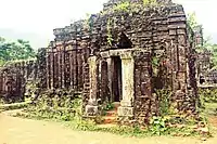 Around 600 AD, Sambhuvarman authorized the construction of the Mỹ Sơn Bhadresvara temple.[7][8] He reinstalled the god under the name Sambhu-Bhadresvara, and erected a stele to document the event. The stele affirmed that Sambhu-Bhadresvara was the creator of the world and the destroyer of sin, and expressed the wish that he "cause happiness in the kingdom of Champa."[9] The stele also applauded the king himself, claiming that he was "like a terrestrial sun illuminating the night" and that his glory rose "like the moon on an autumn evening."[10]