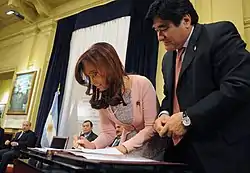 On April 15, 2010, the Chamber of Deputies' General Law Committee and the Committee on Family, Women, Children and Youth recommended the legalization of same-sex marriage.[24][25] On May 5, 2010, the Chamber of Deputies passed the same-sex marriage bill by a vote of 126 to 110.[26][27][28][29] On July 6, the Senate's General Law Committee recommended rejection of the bill.[30] The bill was originally scheduled to be voted on July 14.[31] After a marathon session that went into the early hours of the next day, on July 15 the Senate passed the same-sex marriage bill by a vote of 33 to 27.[32][33][34] On July 21, President Cristina Fernández de Kirchner signed the bill into law.[35][36][37] The law was published in the Boletín Oficial de la República Argentina on July 22 and took effect that same day.[38][39] The law grants same-sex couples all the rights and responsibilities of marriage, including the right to adopt children. The first marriage was performed on July 30, 2010 between Miguel Ángel Calefato and José Luis Navarro in Frías, Santiago del Estero.[40][41]