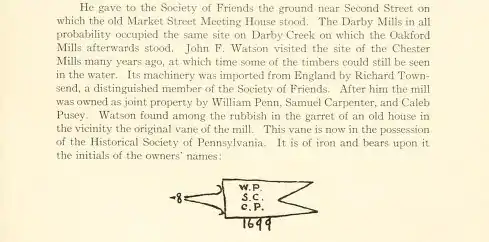 Chapter 7 of the Annals of Philadelphia and Pennsylvania by John F. Watson describes "The Landing at Penn at Chester." In the late 1840s, from the bottom of Chester Creek was found "an iron vane of that mill, curiously wrought into letters and dates." The following picture is direct from page 25 of the Samuel Carpenter book of 1912. The "He" described is William Penn.[2]