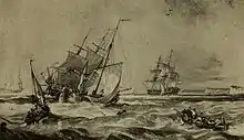 - An English frigate heeling in the swell off a fortified tower (Watercolour - Christie's)