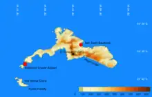 There is a short, 885 m (2,904 ft) airstrip at Robinson Crusoe Airfield in the southwestern end of the Robinson Crusoe Island, the only reasonably flat part of the island. Operations are mostly in twin-engine, seven-seat light planes, with very limited baggage capabilities. The flight time from the mainland of Chile is about 2 hours 30 minutes, plus a 1-hour 30 minute boat ferry to the village at the opposite side of the island.[2]