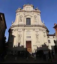 The church was consecrated in 1616, as part of an adjacent Theatine convent. The present façade was constructed in 1731. During the Napoleonic occupation, it was given the satirical name of St Napoleon. After Austrian rule of the region, the church became attached to the parish of Santa Barnaba. Damaged during the Second World War, the church has been closed from 1957 to 2007, when it was opened for worship only on the day of Virgo Fidelis.[1] The first chapel on the left contains the tomb of Giovanni dalle Bande Nere. It is also open for viewing of artworks on certain days. The tomb of Giulio Romano was lost during reconstructions of the past centuries.