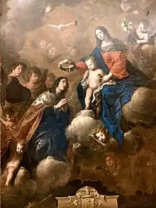 The statue of San Niccolò da Tolentino in the facade was added in 1687.The facade defines the longitudinal layout of a tall central nave and lower flanking aisles, separated from the nave by pilasters and arches. The nave leads to a crossing transept, with a dome, and lastly to a recessed apse. The lateral aisles open to individual chapels. The first chapel on the right has a 1494 baptismal font with a statue of St John the Baptist derived from the nearby, now demolished church of San Giovanni dei Tartari. In 1874, the parish of this church was assigned to this church. In one of the chapels was buried a Spanish Archbishop of the Fajardo family, an Augustinian prelate, who was captured by Muslims while on route to Sicily. Ransomed, he soon died in 1694.[3] On the left nave, is a canvas depicting the Immaculate Conception by Pietro Novelli.[4]