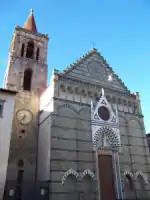 In 1143, the church was enlarged by creating the present nave running along a north to south axis. The work continued into the 14th-century. The exterior is characterized by a typical Tuscan blend of Romanesque and Gothic styles, with a polychrome decoration of the façade. Over the portal is a statue of St James, attributed to Orcagna. The bell-tower, much altered over the centuries, was occupied in the 15th century by the Cancellieri family in their battles with the Panciatichi family. A chapel once at its base was frescoed in 1348 by Paolo di Stefano and in 1441 by Bartolomeo da Giovanni. The chapel was torn down in the mid-19th-century.