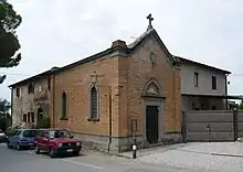 This brick church was erected in the late 19th century, and has a portal with fragments of a mural depicting Ecce Homo. The mouldings and the cross atop the tympanum are stone. Above the entrance is the crest of the Della Gherardesca family; the church contains family tombs. The interior apse is frescoed with a Madonna and child. The remainder of the church has floral and geometric decorations.[1][2]