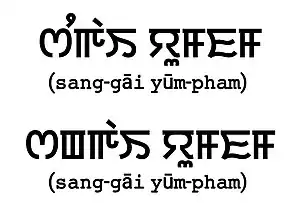 In Meitei language, sanggāi (Meitei: ꯁꯡꯒꯥꯏ) means residence or home, used in formal context.[7] The Meitei term yumpham (Meitei: ꯌꯨꯝꯐꯝ) literally means "the place where a house is built". Morphologically, "yum‑pham" can be divided into two root words, yum (Meitei: ꯌꯨꯝ) and pham (Meitei: ꯐꯝ), meaning 'house' and 'place' respectively.[8]