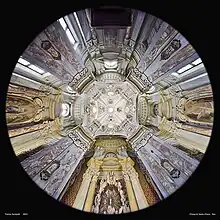 Santa Chiara has a four-lobed central plan set on large pillars that support a complex dome, perforated by windows. The altars were completed in the 20th century. The main altar is overlooked by a large stucco medallion depicting the Glory of the Eucharist with revering angels and nuns. The lateral altars (1943) were decorated by Piero Dalle Ceste. The altar on the left depicts the Immaculate Conception with three Franciscan saints Fedele da Sigmaringa, Veronica Giuliani, and Louis King of France; on the right, St Francis of Assisi in ecstasy.