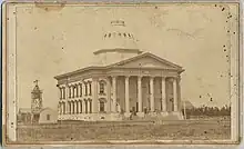 San Jose was chosen as the initial site for the state's capitol in 1849, which it held until 1851, when legislators voted to move to Vallejo.[1] After Santa Clara County was formed on April 25, 1851, a contest was held to select a design for a new building worthy of being a state capitol in 1860. The winning entry, designed by Levi Goodrich, was constructed from 1866 to 1868 at a cost of US$173,737.96 (equivalent to $3,820,000 in 2022).[2]