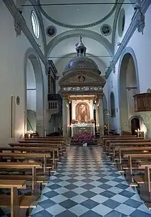 In the centre of the church there is a tempietto or free-standing chapel containing a fresco of the Madonna and child by Bicci di Lorenzo. There is an altarpiece of Christ and John the Baptist in polychrome terracotta by Giovanni della Robbia,[3] and another Madonna and child by Fra Paolo da Pistoia.