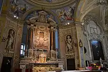 To the side of the presbytery there are two chapels. On the left the chapel of the Crucifix which houses, in a niche in the east wall, the wooden complex of the Crucifix brought as a dowry by the brotherhood of Saint Sebastian. On the north wall there is the canvas of the Resurrection by Pietro Maggi, and on the west wall another canvas with the Assumption of the Virgin.[6] To the right of the presbytery is the Chapel of the Immaculate Conception. On the east wall is the canvas with The Immaculate Conception by Bernardino Ciceri. Opposite, on the other hand, the canvas with the Coronation of the Virgin. In the thick wall that divides the hall from the presbytery, in two small rooms, are placed: on the left the canvas depicting St. Charles Borromeo in bishop's robes on the right, in front, the canvas with St. Alexander Sauli, both canvases were made by Guglielmo Caccia in 1614.[7]