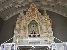 The reliquary is laid open for public veneration every August 17. St. Rita of Cascia (1381) was born in the Italian town of Roccaporena. When her husband and twin sons died, she entered the Augustinian Nuns. The next 40 years of her life saw St. Rita devoting herself to a life of prayer, and works and deeds of charity as dictated by the rules of St Augustine. At age 60, while meditating before the cross, a wound seeming afflicted by a thorn appeared on her forehead. St. Rita began boring the sign of stigmatization which is considered being one with Jesus. Because of the stigmata, she suffered in pain for the next 15 years which she courageously accepted. St. Rita died on May 22, 1457. Her intact and incorrupt body is kept and honored in the shrine at her hometown on Cascia, Italy.[24][25][26][27]