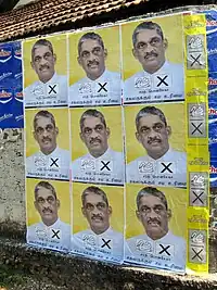 A few months after the defeat of the Tamil Tigers, Fonseka was appointed Chief of Defence Staff by President Mahinda Rajapaksa. While his new post was of a higher rank, Fonseka saw the move as an attempt to sideline him. Amid rumours of his desire to enter politics, he subsequently retired from the post on 16 November 2009.[19][20] On 29 November 2009, Fonseka formally announced his candidature in the 2010 Sri Lankan presidential election. His candidacy was endorsed by the main opposition parties, and Fonseka became the main opposition candidate challenging President Rajapaksa. He campaigned under the sign of a swan, and the slogan Vishvasaniya Venasak (A Credible Change).