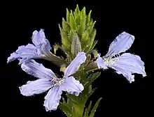 Scaevola nitida (common name - shining fanflower) is an erect shrub in the family Goodeniaceae, native to Western Australia. It grows to a height of 0.3 to 3 m, and its blue-purple flowers may be seen from August to December.[4]