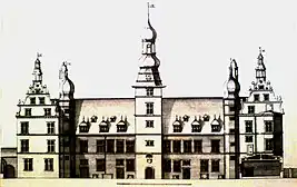 When Husum Castle was completed in the 16th century, the shorter side wings were originally one floor higher than the long central building. The gables of these wings were embellished with ornate and decorative sweeping tail work, similar to what can still be seen on the gatehouse. Due to the higher side wings and a taller roof structure, the castle had different proportions than it does today. Two slender towers with onion-shaped domes were inserted into the angles between the central wing and the shorter side buildings—like a tower found in the southern courtyard corner of Reinbek Castle—and several turrets sat on the high roof ridge.[18] The symmetrical division of the building followed a concept: the long central wing originally housed the grand halls of the castle and was accessed through the central staircase tower, while the northern wing served the duchess and the southern wing served the duke. Both side wings had their own spiral staircases leading to the residential apartments, located at the corners of the courtyard. Until the mid-18th century, it resembled other Nordic Renaissance castles like Rosenborg or Frederiksborg with its multi-towered silhouette.[19]