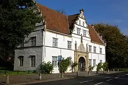 Since the 17th century, Husum Castle has been designated as a "Leibgedinge" (a widow's residence), similar to Reinbek Castle. Duchess Augusta, the widow of Johann Adolf, regularly resided in the Husum Castle from 1610 to 1639. She acquired the neighboring estates of Arlewatt, Hoyerswort, and the Roten Haubarg for her support.[4] Under her and the subsequent Duchess Maria Elisabeth, the town and the castle experienced a short cultural boom.[5] Artists were brought to the court, and the castle was expanded and furnished in an early Baroque style. Maria Elisabeth, the widow of Friedrich III, lived almost exclusively here from 1660 to 1684.[6][7] After her death, the castle was rarely used, such as during the period between 1710 and 1713 when it served as the residence of the bailiff of Husum and Schwabstedt and later the Holstein-Gottorf privy council Henning Friedrich von Bassewitz. Otherwise, it mostly remained vacant.[8]