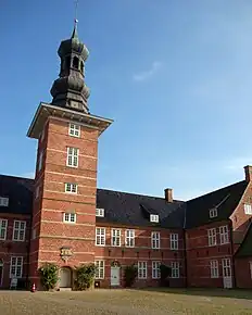 The castle is the direct successor of the Reinbek Castle, which was completed in 1576 and also built by Duke Adolf I. It shares some similarities with Reinbek Castle. Both castles were among the most advanced buildings in the Gottorf part of the duchies when they were completed. Open three-winged layouts were not common in this region before.[13] The traditional type of noble residence until then was the so-called "semi-detached house," and in rare cases, enclosed four-winged complexes were developed. The facades of both castles are built with red brick and divided by horizontal bands of sandstone. The windows were once had with stone-framed mullions, and the towers are crowned with sweeping hoods.[14]