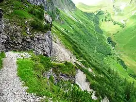 The Schrofen Pass (German: Schrofenpass) is a pedestrian pass (el. 1,688 m) across the Allgäu Alps. It connects Oberstdorf in Germany with Warth in Austria.