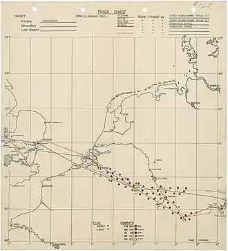 - ↑ Woods, "Combat Claims and Casualties", 17 August 43, "Ramrod 206 Part III" and "Ramrod 206 Part IV", pp. 111–112.