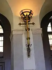 Sconces can be placed on both the interior and exterior walls of buildings.[2] The light is usually, but not always, directed upwards and outwards, rather than down. In pre-modern usage, these usually held candles or gas flame, and torches respectively. Historically, candle sconces were often made of silver or brass from the 17th century, with porcelain and ormolu coming into use during the 18th century. The light of the candle flame was often intensified by a reflecting backplate. Using brackets, the candle or gas flame would be kept at safe distance from the wall and ceiling.[3]