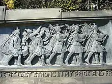 "The Call 1914" (as actually named within the memorial) was designed by R. Tait McKenzie who was a Scottish Canadian working at the time at the University of Pennsylvania in Philadelphia. McKenzie only took to sculpture in later life having started his interests in physical education. His sculpture invariably was of life size male athletic figures. This work took him four years to complete.[1] The bronze backdrop frieze shows Scots of differing professions answering the call and changing from civilians into marching soldiers. It was also by McKenzie, but the architect Reginald Fairlie was also involved. The stonework is constructed from Craigleith sandstone. At the very top of the design are the two intertwined escutcheons of America and Scotland. The memorial was said to have cost ten thousand pounds at the time it was built.[2]