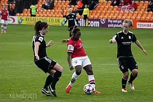 Glasgow City, the SWPL's most successful club, playing Arsenal in a 2014 Champions League match; L-R, Rachel Corsie, Dan Carter and Eilish McSorley