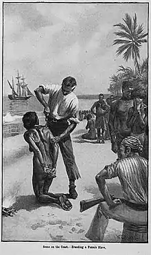 Another way the preparation aspect is defined, is by "seasoning". The seasoning of slaves was a period of adjustment where merchants and traders conditioned enslaved peoples so they could get used to their new life on plantations.[10] The process of seasoning is seen as a way to break the African captives by taking away their identity, so they would be less likely to revolt and get their work done on or off the plantation.[10] In order for the enslaved people to be conditioned correctly traders and merchants would "Creolize" (the act of changing the attitudes of an African-born captive into an American-born bondsperson) by shaving off all of their hair, washing them, oil them down, and then feed them very little.[10] The last part of "Creolizing" an African captive dealt with sending enslaved peoples to the West Indies before being sold in the American South so they knew what it was like to work on plantations. Other forms of seasoning included branding the enslaved with the mark of their new owner, renaming the enslaved in order to strip them from their African identity, and torturing them.[10] During these processes women in particular were subjected to many harsh and unwanted sexual acts that were advanced by the white merchants, and sometimes captive African men.[10]