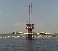 ![]() Commercial tidal stream generator — SeaGen — in Strangford Lough. The visible wake is indicative of the power of the tidal current. | |