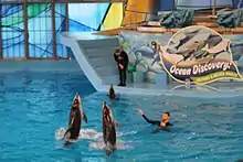 The park also has seven Pacific white-sided dolphins that live at Beluga Stadium. SeaWorld San Antonio is one of two zoological facilities in the United States that cares for Pacific white-sided dolphins.[21]