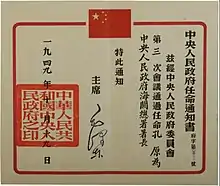 The Seal of the Central People's Government of the People's Republic of China (Chinese: 中华人民共和国中央人民政府之印), or the Founding Seal (Chinese: 开国大印), was the national seal of the People's Republic of China from 1949 to 1959. It is no longer in use, and is kept in the National Museum of China.[1]