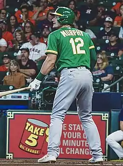 On September 1, 2019, the Athletics selected Murphy's contract and promoted him to the major leagues.[10] On September 4, in his MLB debut, Murphy hit his first career home run for his first hit against Jake Jewell.[11] In 2020, Murphy played the majority of the season as the A's catcher, playing in 43 games. He hit .233 with 7 home runs and 14 RBI.