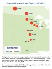 Observable changes in nature related to season creep include birds laying their eggs earlier and buds appearing on some trees in late winter.[12] In addition to advanced budding, flowering trees have been blooming earlier, for example the culturally-important cherry blossoms in Japan,[13][14] and Washington, D.C.[15][16][17] Northern hardwood forests have been trending toward leafing out sooner, and retaining their green canopies longer.[18] The agricultural growing season has also expanded by 10–20 days over the last few decades.[19]