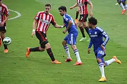 On 1 September 2014, Coates was loaned out to fellow Premier League side Sunderland on a season-long loan, joining up with fellow Uruguayan manager Gus Poyet.[15] He made his debut as a starter on the 23rd in the third round of the League Cup, against Stoke City at the Stadium of Light. At half-time, he was substituted for Patrick van Aanholt and Sunderland lost 1–2.[16] His first league match of his loan was on 3 December, playing the entirety of a 1–4 home defeat against Manchester City.[17] Coates had to fill in at left back in the Tyne-Wear derby against Newcastle on 21 December after Anthony Réveillère suffered an injury in the warm up, but coped well as Sunderland won 1–0.[18] However, after Sunderland were beaten 1–3 by Hull in the next game,[19] Coates fell out of favour and failed to make another Premier League start under Poyet. After the manager was sacked and replaced by Dick Advocaat, Coates became more involved. He played every minute of Sunderland's run of five unbeaten games that kept them from relegation with a game to spare.