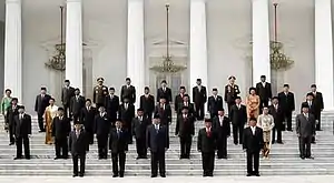 The Second United Indonesia Cabinet (Indonesian: Kabinet Indonesia Bersatu II) was sworn in on 22 October 2009, two days after the inauguration of President Susilo Bambang Yudhoyono for the second term. The cabinet consists of members from Yudhoyono's Democratic Party and its coalition partners (the Prosperous Justice Party, the National Mandate Party, the United Development Party, National Awakening Party and the Golkar Party) as well as non-party figures.[1][2]