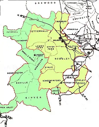 The Hundred contained Wolverhampton, the largest town of the county, and many populous villages, which were constituted into 15 parishes, part of 5 others and 2 extra-parochial areas. The extensive parish of Wolverhampton contained several townships, only some of which were in Seisdon Hundred.[5]