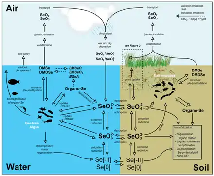 1. Winkel, Lenny; Vriens, Bas; Jones, Gerrad; Schneider, Leila; Pilon-Smits, Elizabeth; Bañuelos, Gary (2015). "Selenium Cycling Across Soil-Plant-Atmosphere Interfaces: A Critical Review". Nutrients. 7 (6): 4199–4239. doi:10.3390/nu7064199. PMC 4488781. PMID 26035246. Material was copied from this source, which is available under a Creative Commons Attribution 4.0 International License.