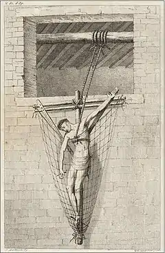 ![]() Mattio Lovat hanging from a window during his self-crucifixion attempt | |