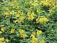 The flower heads are normally rayed with the heads borne in branched clusters, and usually completely yellow, but green, purple, white and blue flowers are known as well.