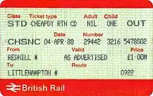 By this time, the "Day Returns Only" card could only be used to buy Cheap Day Returns, following the introduction of the "Cheap Day" fare to distinguish between peak-time and off-peak journeys. "Cheap Day Returns Only" wording began to appear on these Railcards accordingly; but they were withdrawn from 10 January 1988, with the price of the "full" Railcard being increased from £12.00 to £15.00 at the same time. The APTIS ticket issuing system had been introduced in late 1986, and was still in the process of being rolled out across the British Rail network in 1988, so the APTIS "Cheap Day Returns Only" Railcard (form number BR 4599/18) is rarely seen. The first APTIS version of the full Railcard (BR 4599/17), with mauve upper and lower bands,B also lasted until 10 January 1988,[7] at which point the following changes were made: security background (miniature repeats of the words "British Rail") was changed from the light green colour seen on most APTIS ticket stock to a dark pink; the upper and lower bands became dark brown; and part of the background was filled with the words "Senior Citizen Railcard" in cursive writing in white. This style lasted only until October 1988, at which point the white lettering changed to brown.[7][8]