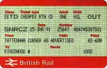 12 May 1985 saw changes to the range of fares which received discounts, and in some cases to the level of the discounts, in respect of the "full" version of the Railcard (which by now cost £12.00). The "Day Returns Only" Railcard still gave 50% discounts on those fares, but the full version now gave only a 34% saving on Standard Single and Return fares and the new off-peak Saver tickets. ("Standard" was the new name for the former "Ordinary" category of ticket, being the highest priced and least restricted. These are now known as "Open" tickets.) A 50% discount was now only available on Day Returns and the new off-peak equivalent, the Cheap Day Return.[4] Further restrictions on journeys by ferry and ship were made in 1985 and 1986, while Rover and Ranger tickets of all types ("go-anywhere" multi-journey tickets covering particular geographic areas) were included within the discount scheme from May 1987, with a saving of 34% available for Railcard holders.[6]