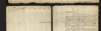 According to Jantz, the original manuscript of the letter was sold by the widow of the collector who once owned it to the Boston College and David Levin had reaffirmed the authenticity and "double checked with some of the experts who had verified Mather's handwriting at the time of acquisition..." and found the paper "of the right age." Neither Jantz nor Levin seem to have noted that the letter could be further verified by a line of handwriting by Stoughton (the AAS typescript also contains this line at the end, copied with a pen) a paraphrased version of this opening line was reprinted by Mather in his book some weeks later.[27] Stacy Schiff, writing thirty years after Jantz and Levin, seems to be the first person on record to take notice of this fact, "Stoughton began his fulsome reply on the verso."