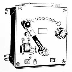 This starter includes a no-voltage magnetic holding feature, which causes the rheostat to spring to the off position if power is lost, so that the motor does not later attempt to restart in the full-voltage position. It also has overcurrent protection that trips the lever to the off position if excessive current over a set amount is detected.[27]