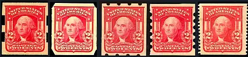 The exception, the 4¢ imperforate value, is a particularly notable rarity, because no copies of the stamp in its originally-issued imperforate form survive. All of these 4¢ issues were incised with private "hyphen-hole" perforations by the Schermack company, and examples of them can fetch upwards of $50,000. Perhaps because the stamp no longer exists as released, Scott did not assign it a separate number, but listed it as #314A (#314 belongs to the 1¢ imperforate version).[1] The 1¢, 2¢ and 5¢ imperforate stamps exist with a variety of private perforations produced by five companies: Schermack, U. S. Automatic Vending, Brinkerhoff (1¢ and 2¢ only), Mail-O-Meter (2¢ only) and International Vending Machine (2¢ only).[19]