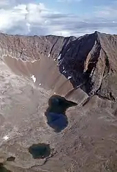 The Seward Peninsula has several distinct geologic features. The Devil Mountain Lakes on the northern portion of the peninsula are the largest maar lakes in the world and part of the Espenberg volcanic field. They were formed over 21,000 years ago as the result of an underground steam explosion.[4] The Killeak Lakes and White Fish Lake are also volcanic maar lakes of notable size on the northern Seward Peninsula. Four mountain ranges line the southern side of the peninsula, the most prominent being the Kigluaik (or Sawtooth) Mountains. The highest point in the range and the peninsula is the peak of 4,714 ft (1,437 m) Mount Osborn. Other mountain ranges on the Seward Peninsula include the Bendeleben Mountains, Darby Mountains, and York Mountains. The Bendeleben Mountains exhibit evidence of recent faulting in the late Cenozoic, with the majority of tectonic deformation and mountain formation occurring in the Cretaceous, which is attributed to regional tectonic block rotation of the Bering plate in the Arctic.[5] The Lost Jim Lava Flow north of Kuzitrin Lake is a lava field formed roughly 1,000 to 2,000 years ago, which covers roughly 88 sq mi (230 km2).