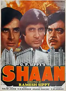 Shaan (translation: Grandeur) is a 1980 Indian Hindi-language action thriller film directed by Ramesh Sippy and produced by G. P. Sippy under the production banner of Sippy Films with a story written by Salim–Javed after the blockbuster success of their previous venture, Sholay (1975). Released in India on 12 December 1980, the film stars an ensemble cast of Sunil Dutt, Shashi Kapoor, Amitabh Bachchan, Shatrughan Sinha, Raakhee Gulzar, Parveen Babi, Bindiya Goswami, Johnny Walker and Kulbhushan Kharbanda. The music was composed by R. D. Burman.