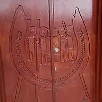 Carving of a ship carrying Mandaean souls, on the front door of the Ganzibra Dakhil Mandi in Liverpool, New South Wales, Australia. It is based on the manuscript illustration above.