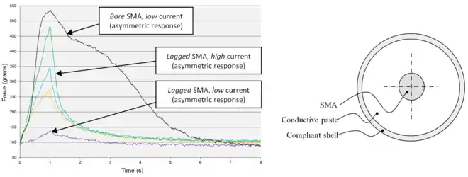 Novel methods to enhance the feasibility of SMA actuators include the use of a conductive "lagging". this method uses a thermal paste to rapidly transfer heat from the SMA by conduction. This heat is then more readily transferred to the environment by convection as the outer radii (and heat transfer area) are significantly greater than for the bare wire. This method results in a significant reduction in deactivation time and a symmetric activation profile. As a consequence of the increased heat transfer rate, the required current to achieve a given actuation force is increased.[30]