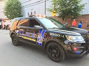 The Sharpsburg Borough Police Department (3500 units) formed in 1883. The composition of the Department includes the Chief of Police, five full-time patrolmen, as well as numerous part-time officers. Three vehicles, all Ford Explorers, are used in day-to-day operations by the department. Police headquarters is located in the Municipal Building at 1611 Main Street, in the Borough.