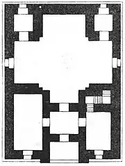 On the opposite side of the door, between the branches of the cross there are two small rooms inside the thick stone walls. It is supposed to be used as a cell or warehouse where the tomb items were stored.[8] The external side of the dome covering upper part of the middle of the hall were decorated with glazed tiles. However, those tiles do not currently exist.[7]