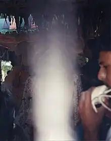 Sathyaraju claimed to have experienced samadhi (enlightenment) on August 7, 1949, when he was fourteen years old.[11] He was sitting on the bank of the Godavari irrigation canal just outside the village, eating palmyra fruit that he had divided up between him and his eleven friends. As Shivabalayogi described the incident, he was squeezing the fruit when it began to tremble with vibrations; a bright light emanated from the fruit in his hands, and he heard the cosmic sound of Aum.[12] As he watched, a black lingam (symbolizing the absoluteness of the Divinity), about a foot and a half tall, appeared in his hands. The lingam broke in two and a tall, handsome man emerged standing in front of the boy.[13] The man was in the form of a jangama Devara, an ascetic who worships and dresses like Lord Shiva. His dark skin appeared smeared with light ash. He wore a white dhoti, a necklace of rudraksha beads, and his matted hair piled on top of his head, in the manner of the yogis of ancient times.[11] He was extremely handsome with large, beautiful eyes. A bright light emanated from him, and all Sathyaraju could see was the yogi and the divine light.[11] The yogi instructed Sathyaraju to sit in a cross-legged position and close his eyes. The yogi touched the boy's forehead at the spiritual third eye (bhrikuti) between the eyebrows, then gently tapped him on top of the head. Sathyaraju immediately passed into samadhi.[14][15] His friends saw him sitting as if in deep meditation, leading them to think that he was acting. But when they were unable to rouse him from this state, they were afraid Sathyaraju was either possessed by a spirit or dead.[16][17]