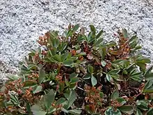 Sibbaldia procumbens (or creeping sibbaldia) is a species of flowering plant of the genus Sibbaldia in the rose family.[1] It has an Arctic–alpine distribution; it can be found throughout the Arctic, as well as at higher elevations in the mountains of Eurasia and North America. It grows on tundra and in alpine climates where snow remains year-round, and on subalpine mountain slopes. This is a low, mat-forming perennial herb producing clumps of herbage in rocky, gravelly substrate. A spreading stem up to 15 centimeters long grows from a caudex. Each leaf is divided into usually three leaflets borne at the end of a petiole up to 7 centimeters long. Each wedge-shaped leaflet has three teeth at the tip. The flower has usually five pointed green bractlets, five wider pointed green sepals, and five tiny yellowish petals each about a millimeter long. The fruits develop in the remnants of the sepals on erect stalks.